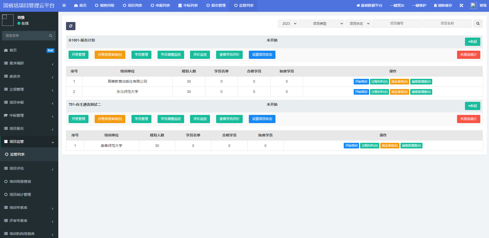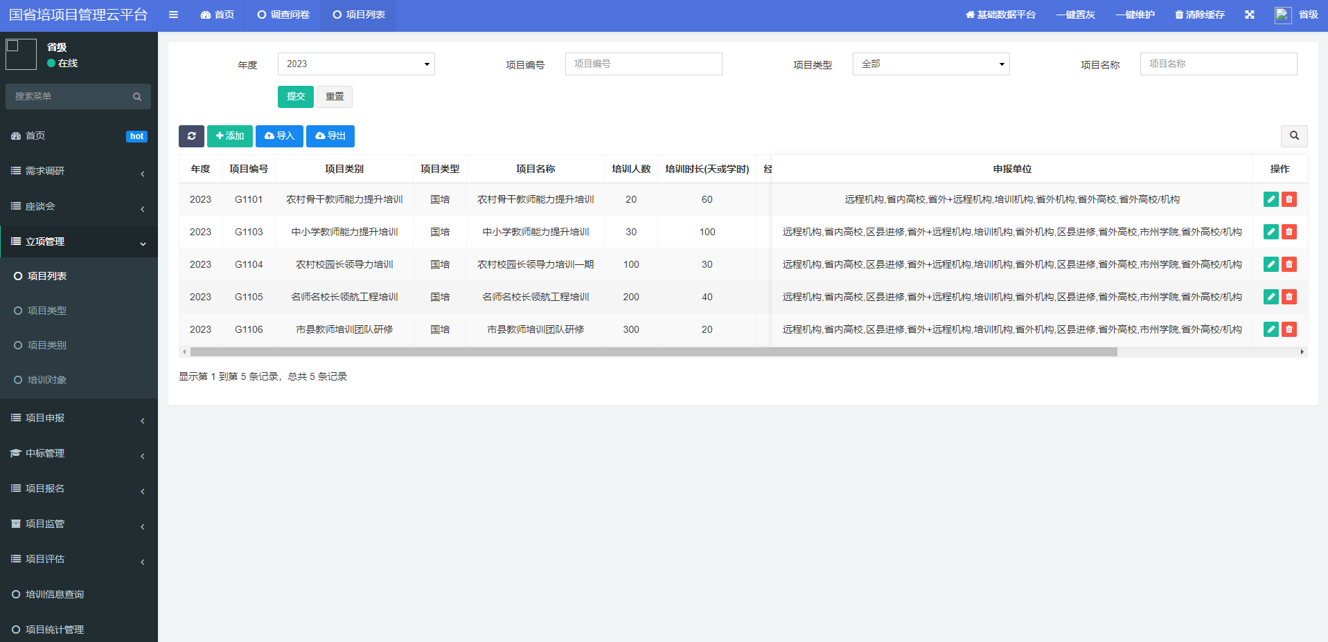 实现国省培培训项目的流程化管理,主要包括项目立项、招标报名、专家评审、中标结果公布、市州区县学校报名、培训过程监管、培训绩效评估、电子证书发放等功能。