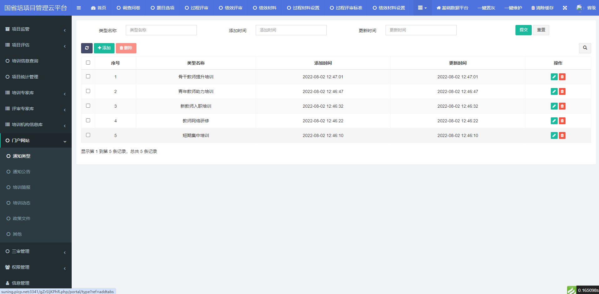 管理门户首页内容设置,包括通知公告、培训动态、资源文件等功能